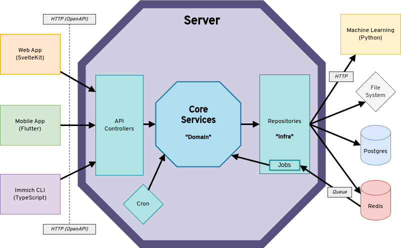 The Immich Server is a TypeScript project written for Node.js. It uses the Nest.js framework, with TypeORM for database management. The server codebase also loosely follows the Hexagonal Architecture. Specifically, we aim to separate technology specific implementations (infra/) from core business logic (domain/).